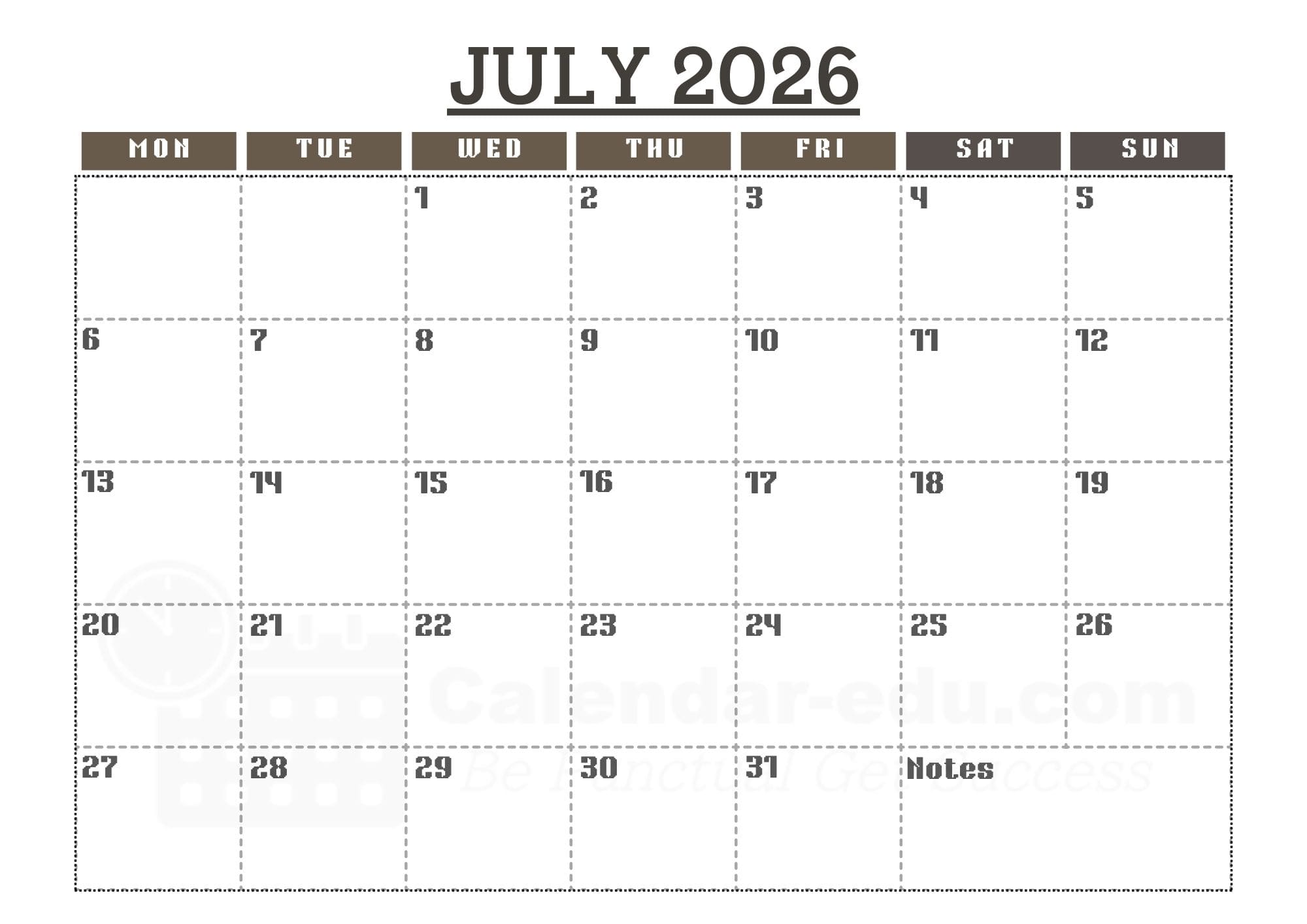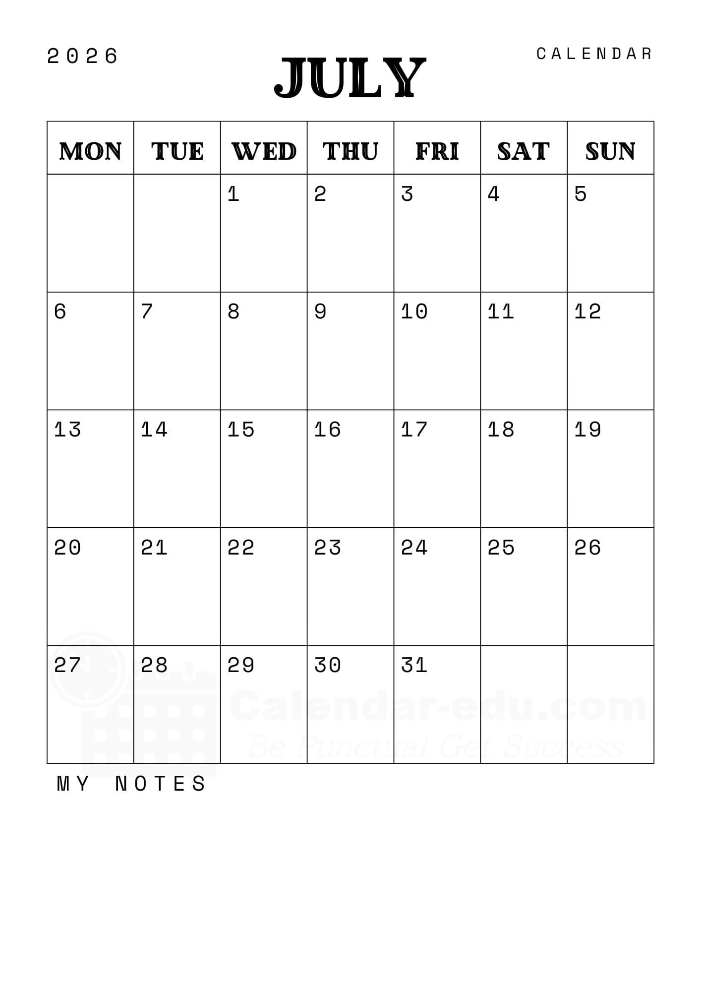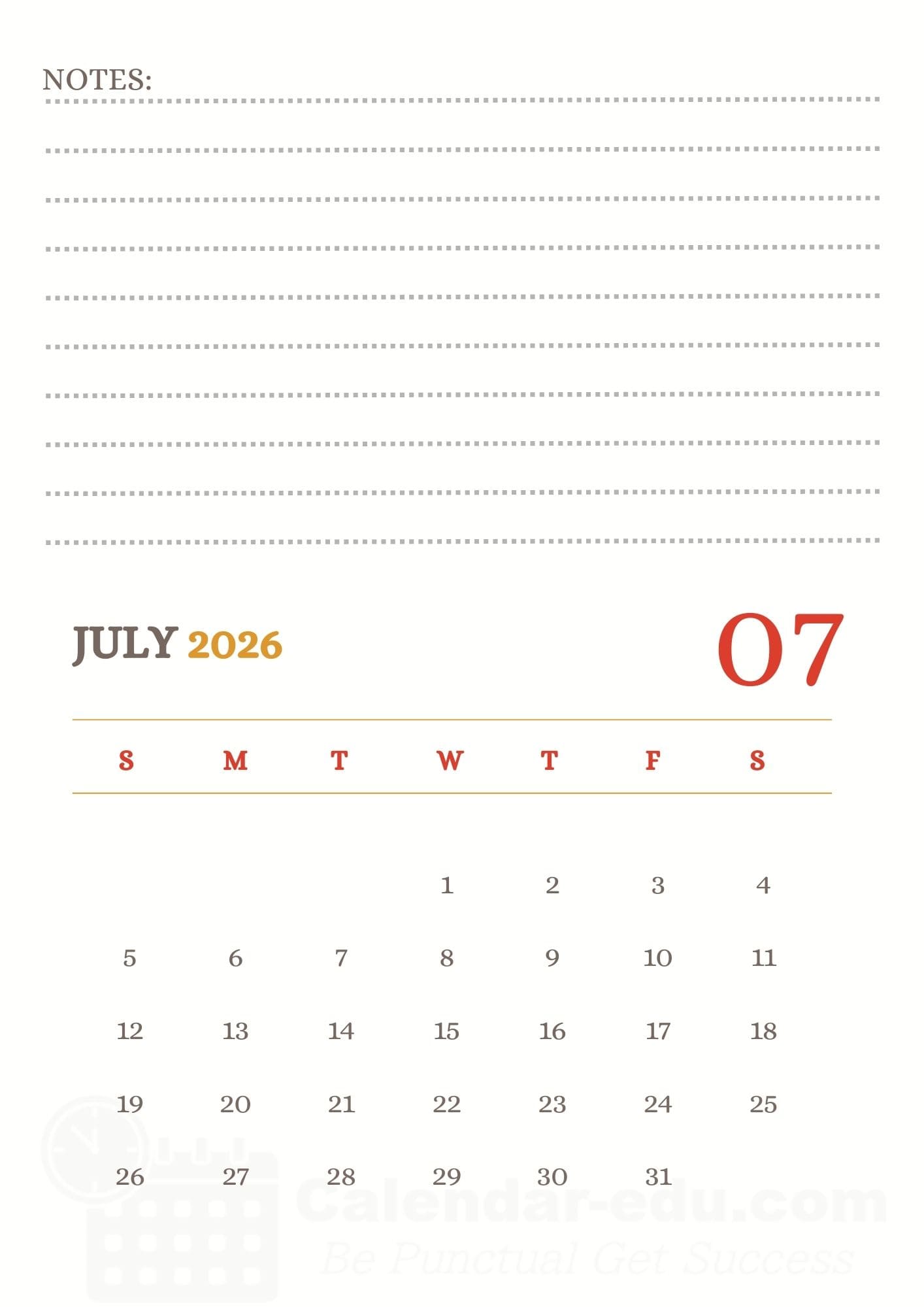 Pro-Tip: Effective scheduling is about taking control of your time to focus on high priority tasks. Use the blank space on our July 2026 calendar with notes in JPG and PDF format to block time specifically for goal oriented work, ensuring deadlines are met without sacrificing your well being.