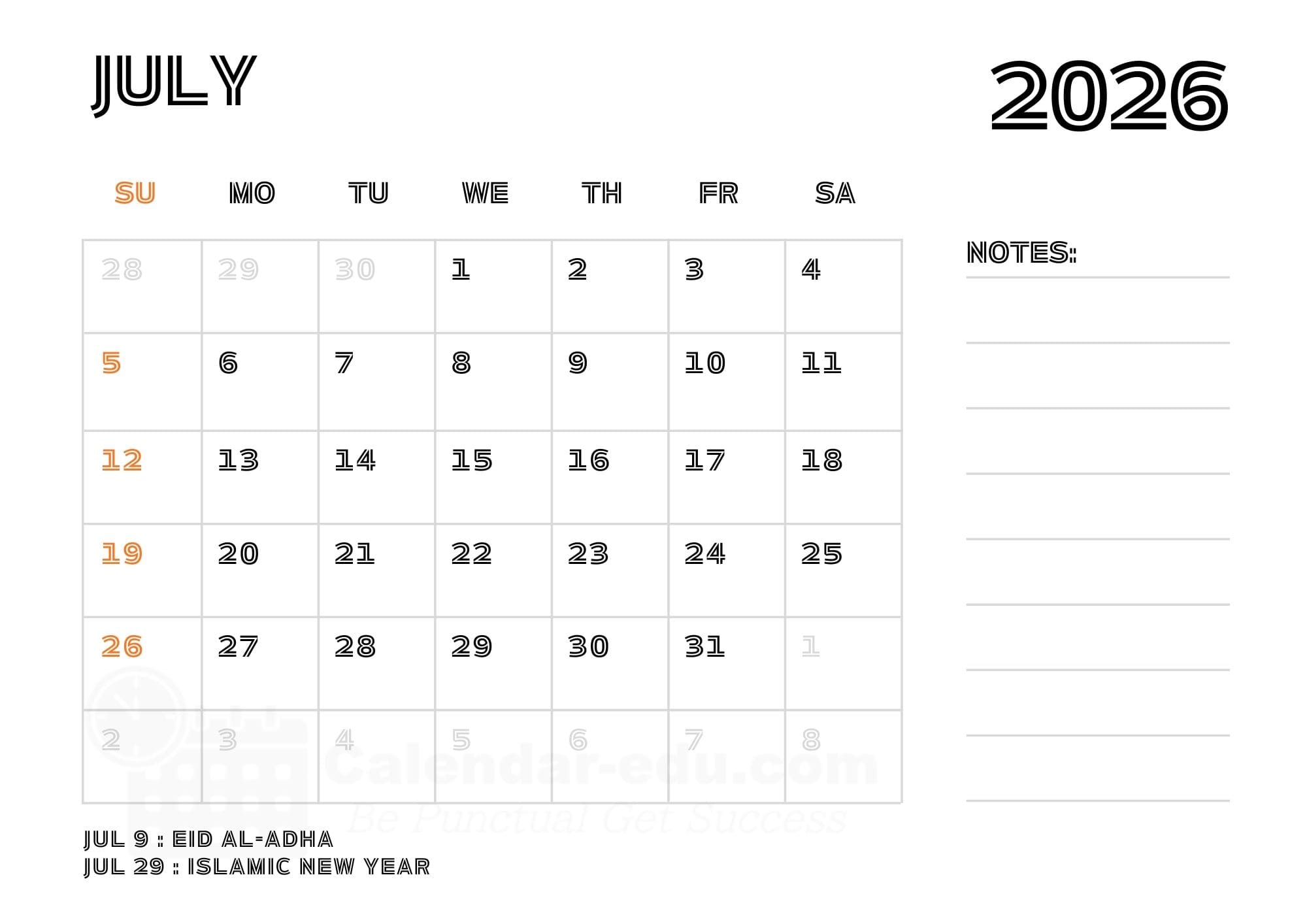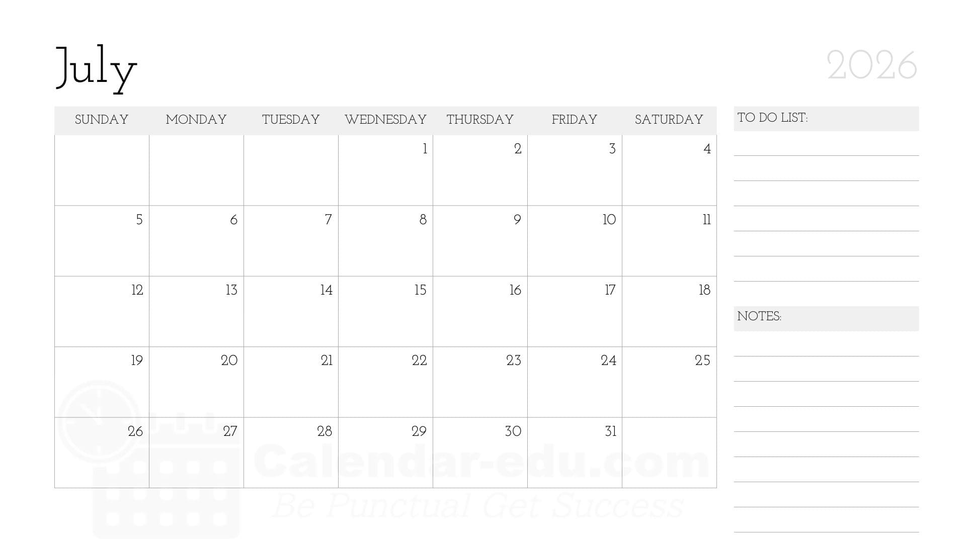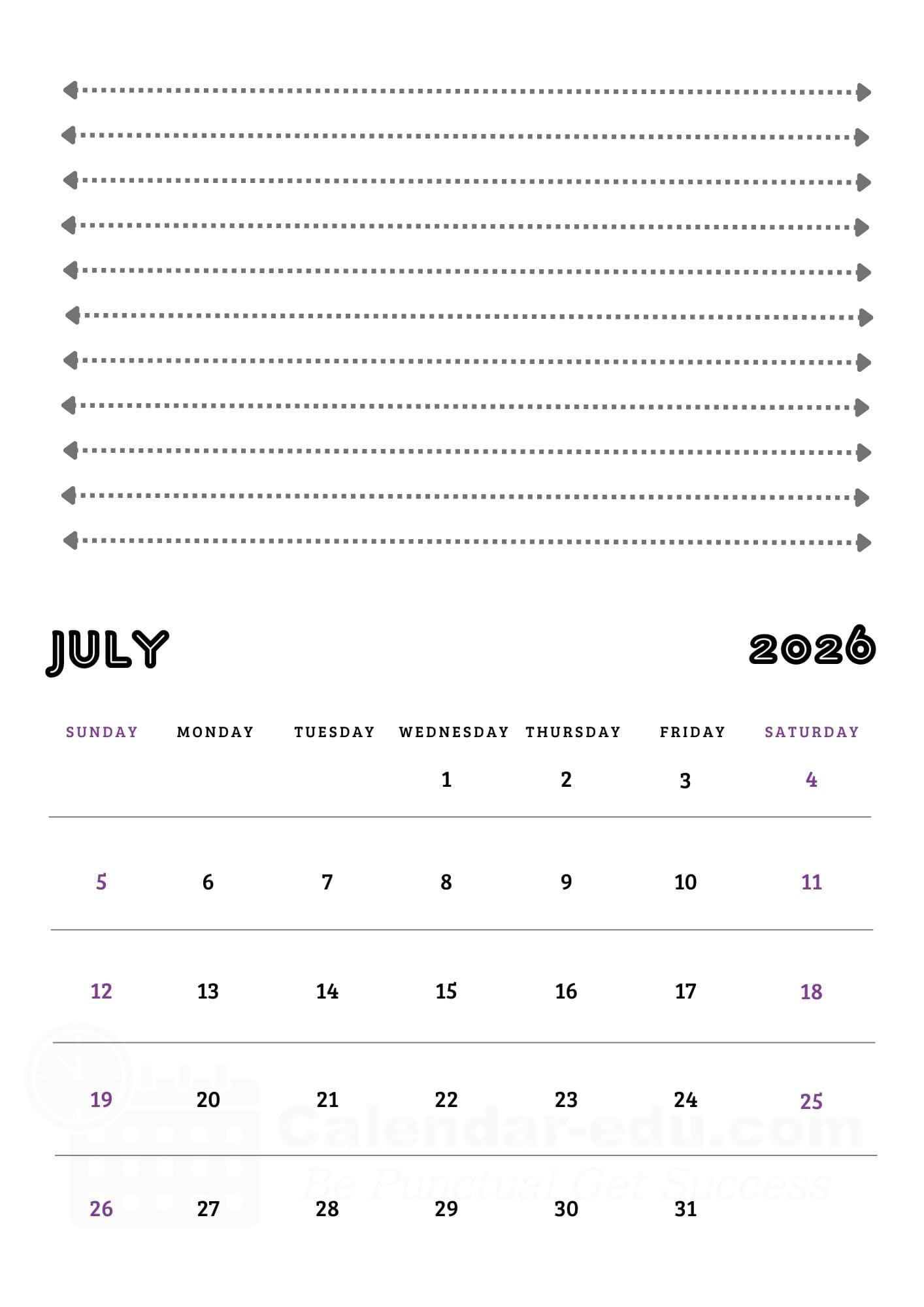 Pro-Tip: Effective scheduling is about taking control of your time to focus on high priority tasks. Use the blank space on our July 2026 calendar with notes in JPG and PDF format to block time specifically for goal oriented work, ensuring deadlines are met without sacrificing your well being.