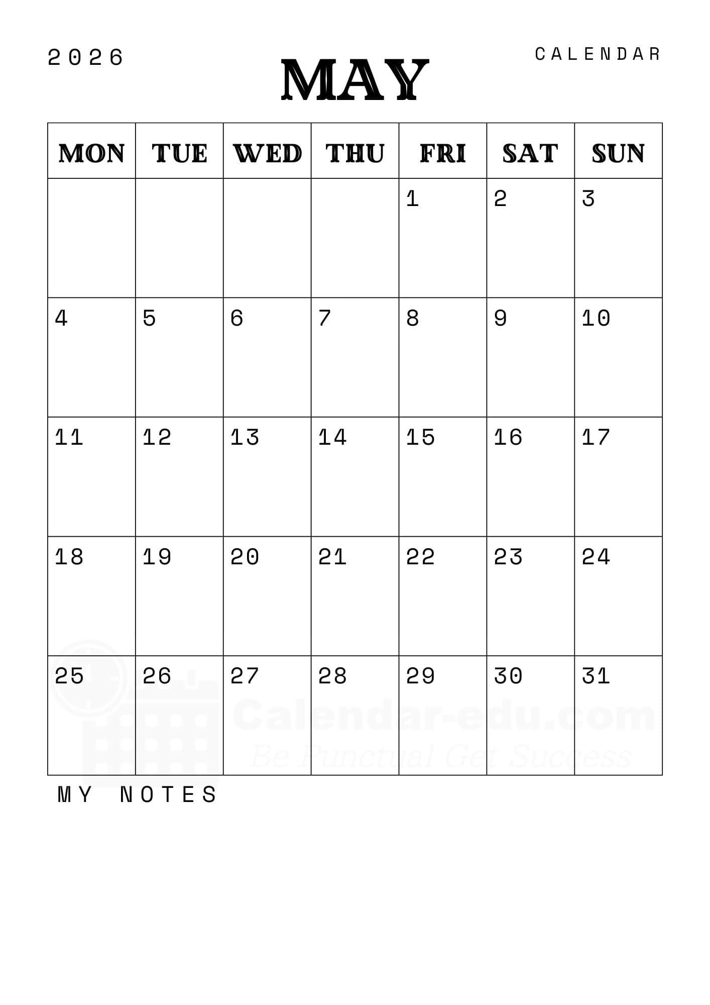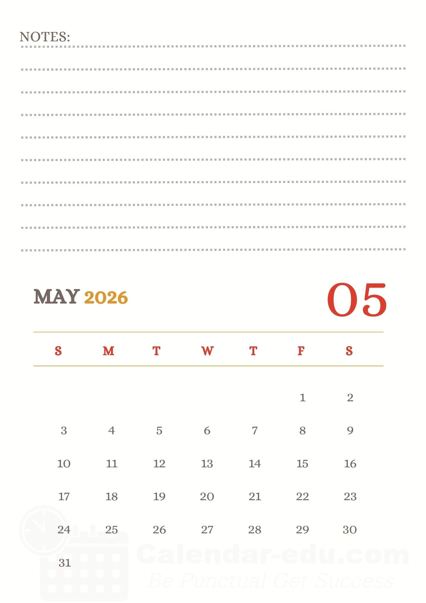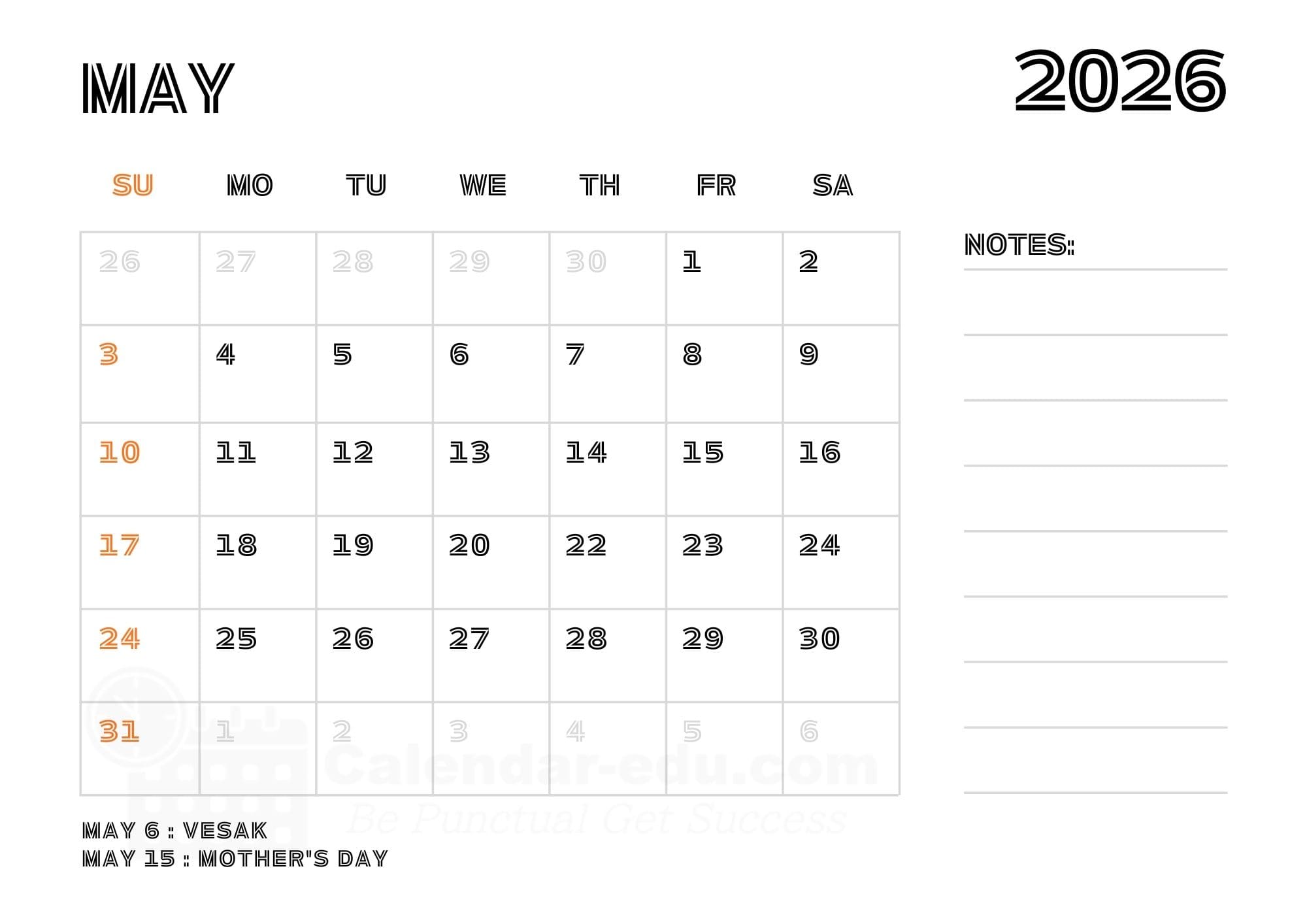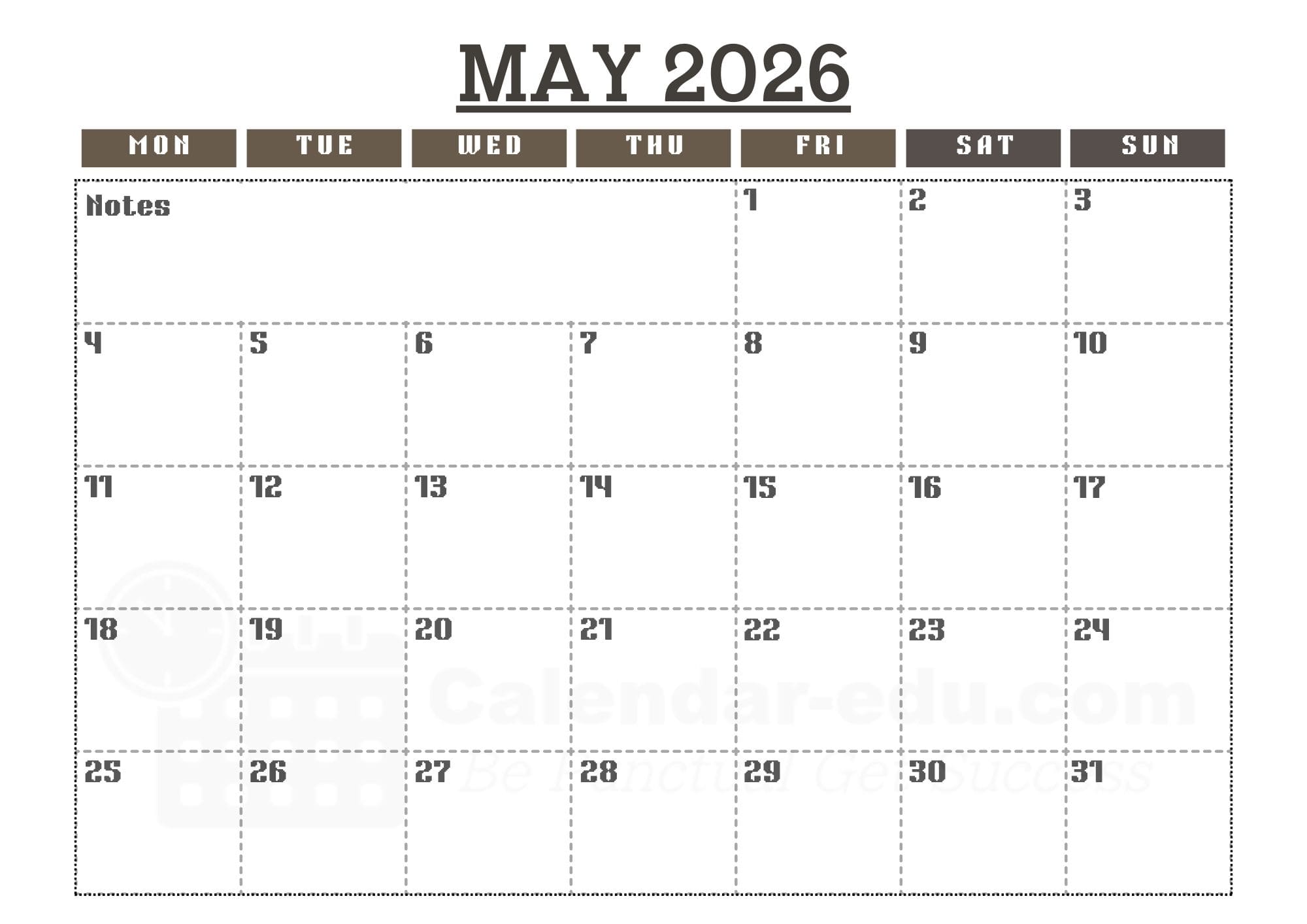Simply download the May 2026 calendar printable with notes in PDF and JPG format, mark your goals, and pin it to your office desk or refrigerator. Having your monthly plan visible is a proven way to stay focused and organized throughout the month.