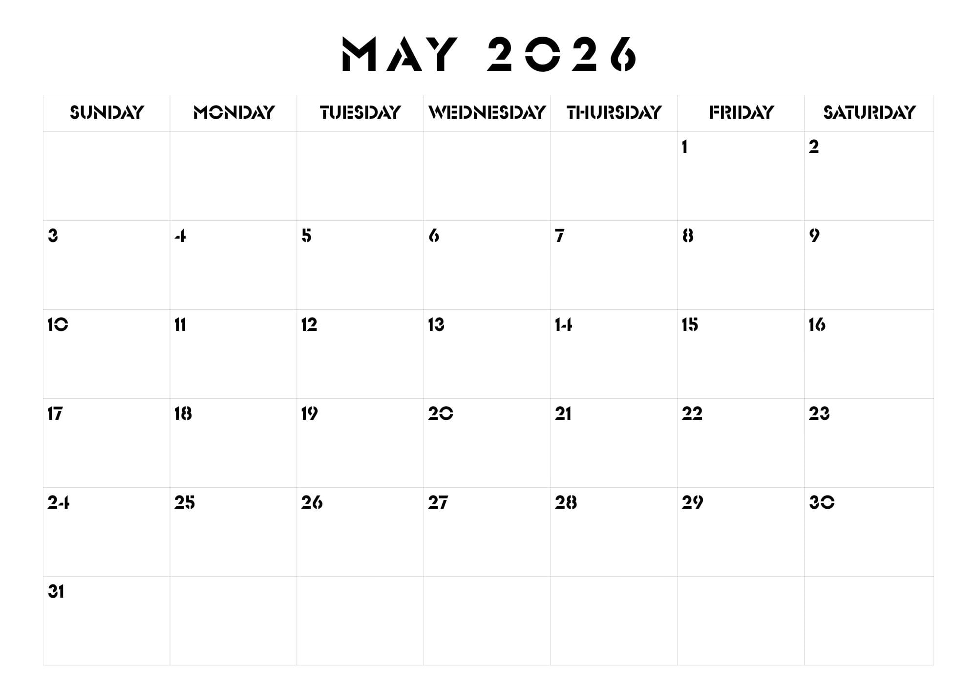 As the fifth month of the year, May 2026 brings 31 days of opportunities. Using a monthly May 2026 PDF or JPG calendar is the best way to: